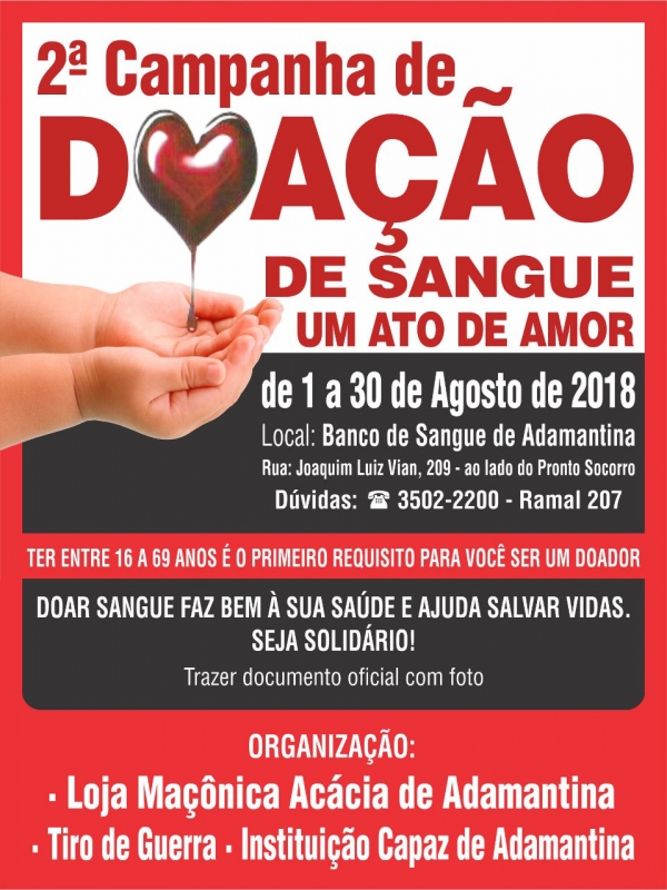 Três instituições de Adamantina – Loja Maçônica Acácia, Tiro de Guerra e Instituição Capaz – se uniram e lançaram uma campanha que visa estimular a doação de sangue entre a comunidade, para o Banco de Sangue da Santa Casa local.