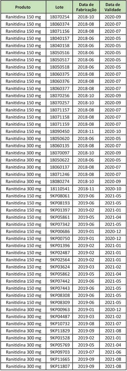 O recolhimento da Medley, do medicamento Ranitidina de 150mg e 300mg, envolve os seguintes lotes: