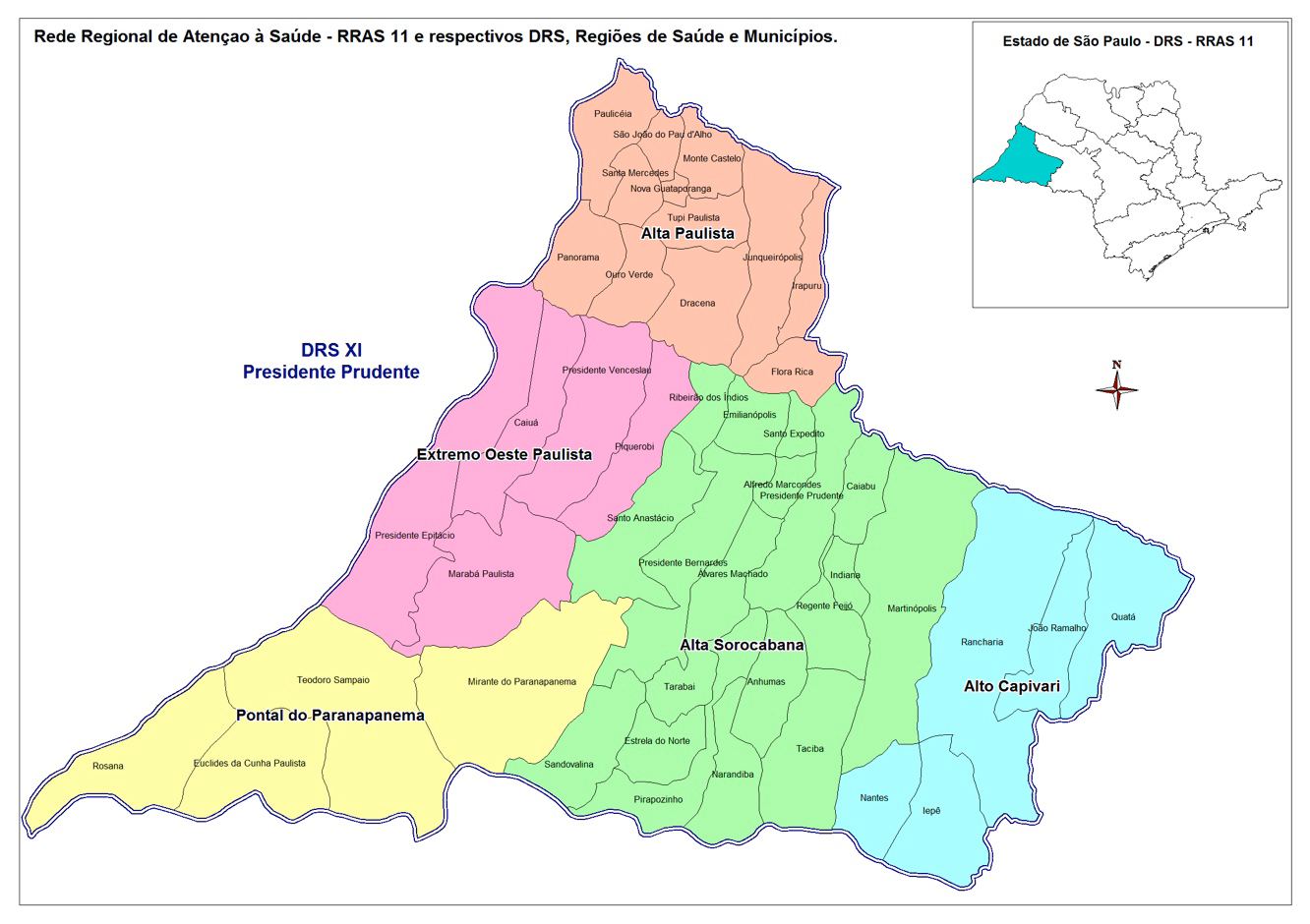 Alfredo Marcondes, Álvares Machado, Anhumas, Bastos, Caiabu, Dracena, Emilianópolis, Estrela do Norte, Euclides da Cunha Paulista, Flórida Paulista, Flora Rica, Iepê, Indiana, João Ramalho, Martinópolis, Mirante do Paranapanema, Nantes, Narandiba, Piquerobi, Pirapozinho, Presidente Bernardes, Presidente Epitácio, Presidente Prudente, Presidente Venceslau, Quatá, Rancharia, Regente Feijó, Ribeirão dos Índios, Rosana, Sandovalina, Santo Anastácio, Santo Expedito, Teodoro Sampaio, Taciba e Tarabai.