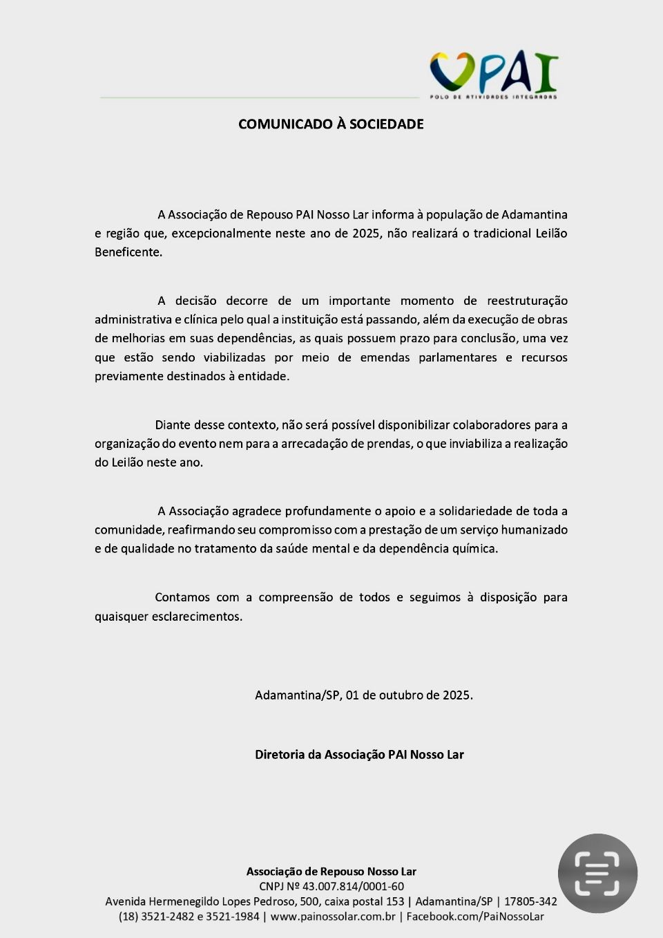 A Associação de Repouso PAI Nosso Lar de Adamantina anunciou que não realizará seu tradicional Leilão Beneficente de Gado neste ano de 2025.