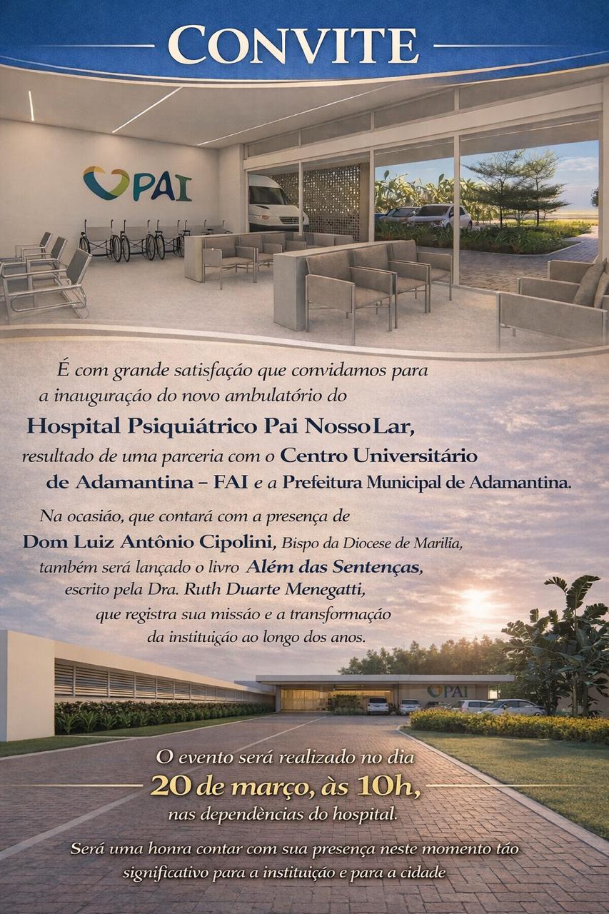 A Clínica Pai Nosso Lar realiza na próxima sexta-feira (20), às 10h, em suas dependências, em Adamantina, a cerimônia de inauguração do novo espaço de atendimento em psiquiatria. As obras no local foram iniciadas em maio do ano passado.