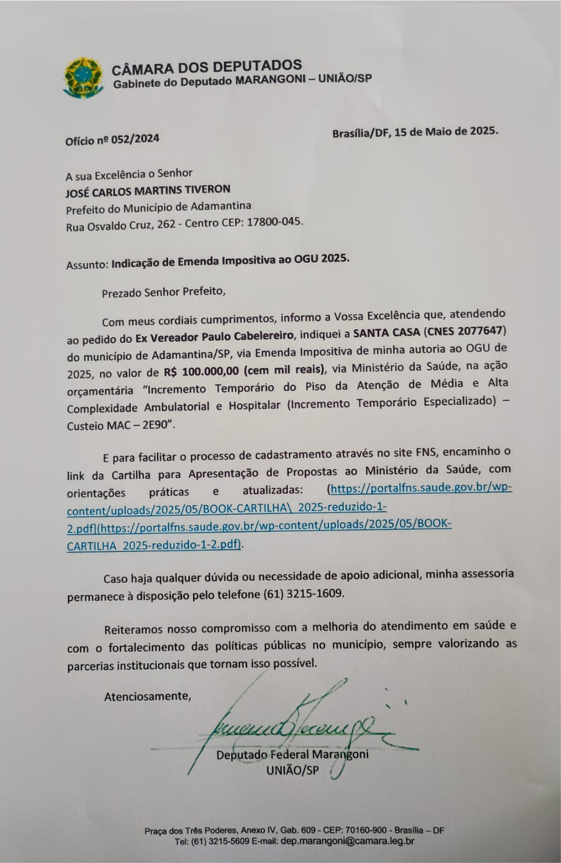 Em Adamantina, a articulação política do ex-vereador Paulo Cervelheira junto ao deputado federal Fernando Marangoni (União/SP) resultou na destinação de emenda impositiva ao orçamento da União de 2025, beneficiando diretamente a Santa Casa de Misericórdia de Adamantina na Providência de Deus. O anúncio oficial foi feito por meio de ofício encaminhado por Marangoni aos representantes municipais, datado de 15 de maio de 2025.