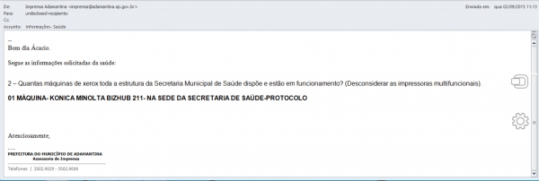 A reportagem do SIGA MAIS solicitou à Prefeitura de Adamantina, junto à assessoria de imprensa, informações sobre o número de máquinas de cópias existentes na Secretaria Municipal de Saúde, exceto impressoras multifuncionais. A resposta recebida foi de que existe apenas uma máquina.