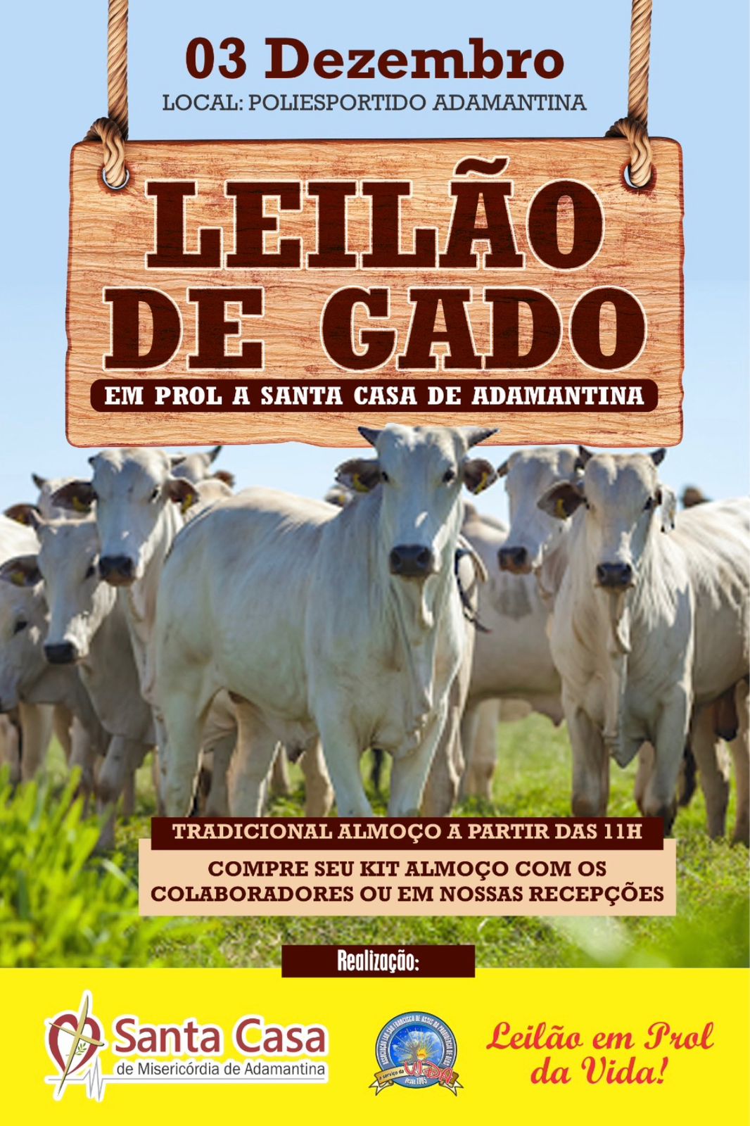 A Santa Casa de Adamantina realiza neste domingo (3) seu tradicional leilão de gado e almoço beneficentes. A atividade acontece a partir das 11h no Recinto Poliesportivo e sua organização mobiliza seus dirigentes, colaboradores e apoiadores da iniciativa.