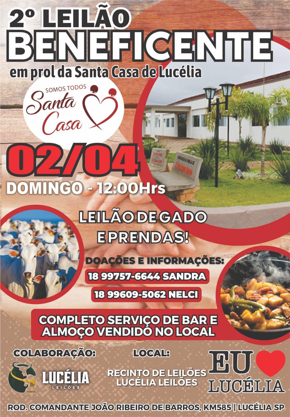 A Santa Casa de Misericórdia de Lucélia realiza no dia 2 de abril seu 2º leilão beneficente de gado e prendas. A iniciativa, da administração do hospital, colaboradores, apoiadores e voluntários, visa arrecadar fundos para o custeio das atividades da estrutura de saúde.