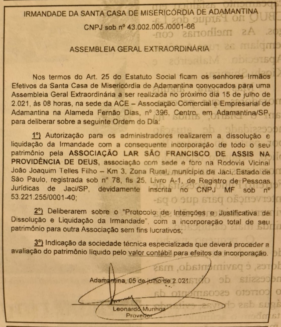 A Assembleia vai acontecer nesta quinta-feira, 15 de julho, às 8h, na sede da Associação Comercial e Empresarial (ACE), com a seguinte ordem do dia: “Autorização para que os administradores realizem a dissolução e liquidação da Irmandade com a consequente incorporação de todo o seu patrimônio para a Associação Lar São Francisco de Asis na Providência de Deus, associação com sede e foro na Rodovia Vicinal João Joaquim Telles Filho, km 3, Zona Rural, Município de Jaci, Estado de São Paulo”.