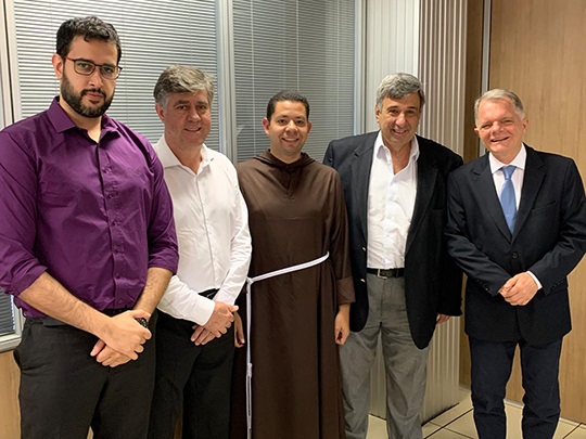 Gerente administrativo da Santa Casa, Renato Sobral, Prefeito Márcio Cardim, Frei Mateus Alves, administrador da Santa Casa local, Superintendente do Iamspe, Wilson Modesto Pollara e o deputado estadual Mauro Bragato durante reunião em São Paulo (Da Assessoria).