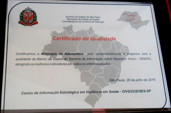 Representantes da Secretaria Municipal de Saúde de Adamantina receberam hoje (28) em São Paulo o prêmio de reconhecimento realizado pela Secretaria Estadual de Saúde, pela qualidade da coleta, preenchimento e digitação das informações do banco do Sistema de Informações sobre Nascidos Vivos (SINASC) e do Sistema de Informação sobre Mortalidade (SIM), realizado na cidade.