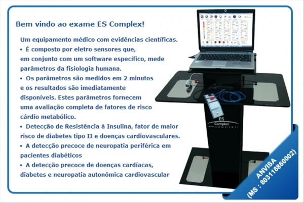 ES Complex é um moderno equipamento médico com evidências científicas, com certificação ISO, registro na ANVISA e certificação americana FDA, composto por eletro sensores que, em conjunto com um programa específico, mede parâmetros sobre o funcionamento do organismo humano. “Essa medição é realizada em 2 minutos e os resultados são imediatamente disponíveis”, revelam os médicos Dr. Alex e Dra. Ana Carolina. “Os exames não são invasivos e não provocam dor”, completam.