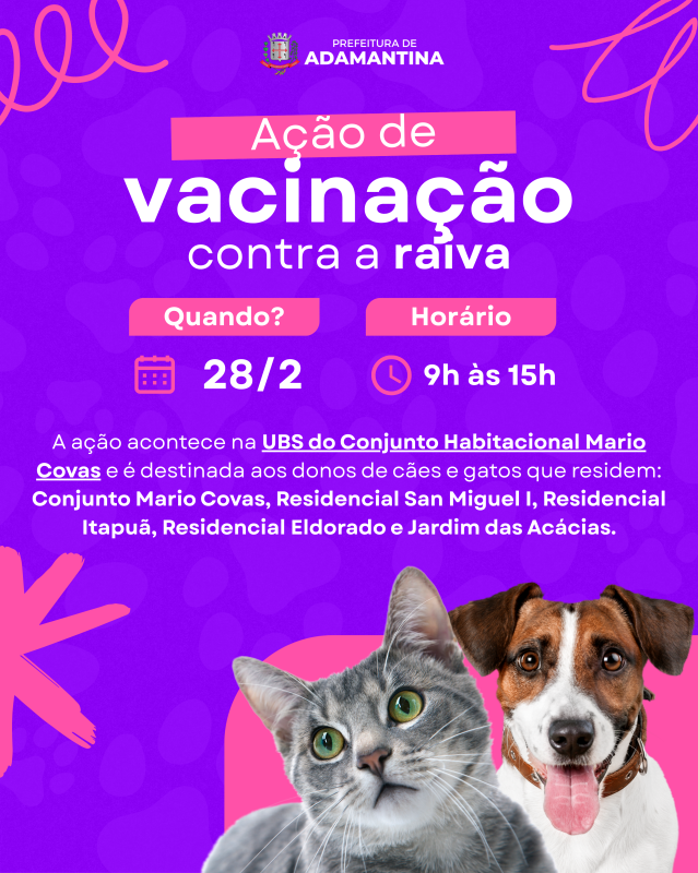 A Prefeitura de Adamantina promove neste sábado (28) mais uma ação de vacinação antirrábica destinada a cães e gatos, por meio da Secretaria Municipal de Saúde. A imunização será realizada das 9h às 15h, na Unidade Básica de Saúde (UBS) do Conjunto Habitacional Mário Covas.